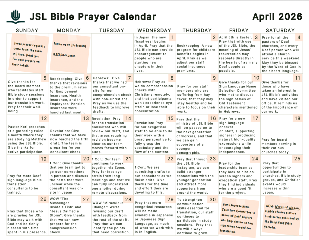 Without the prayers, donations, and support of our partners, we would be unable to continue this work. Consider joining us in our work to give Japanese Deaf their own JSL Bible.