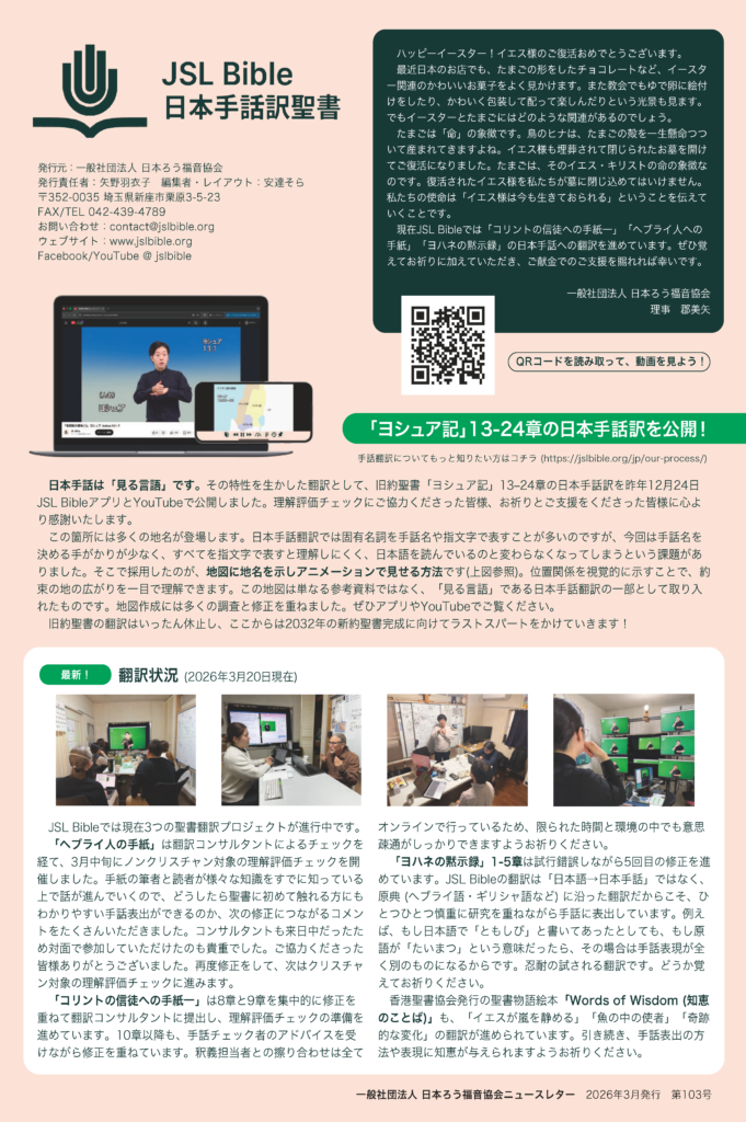 💡本号の主な内容・「ヨシュア記」13-24章の日本手話訳公開!・最新の翻訳状況・JSL Bibleのおしごと「翻訳コンサルタント」編